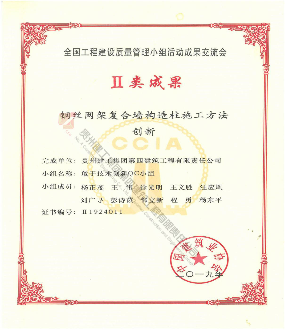 贵州建工集团第四建筑工程有限责任公司敢于技术创新QC小组,荣获中国建筑业协会2019年度全国工程建设质量管理小组活动Ⅱ类成果奖。