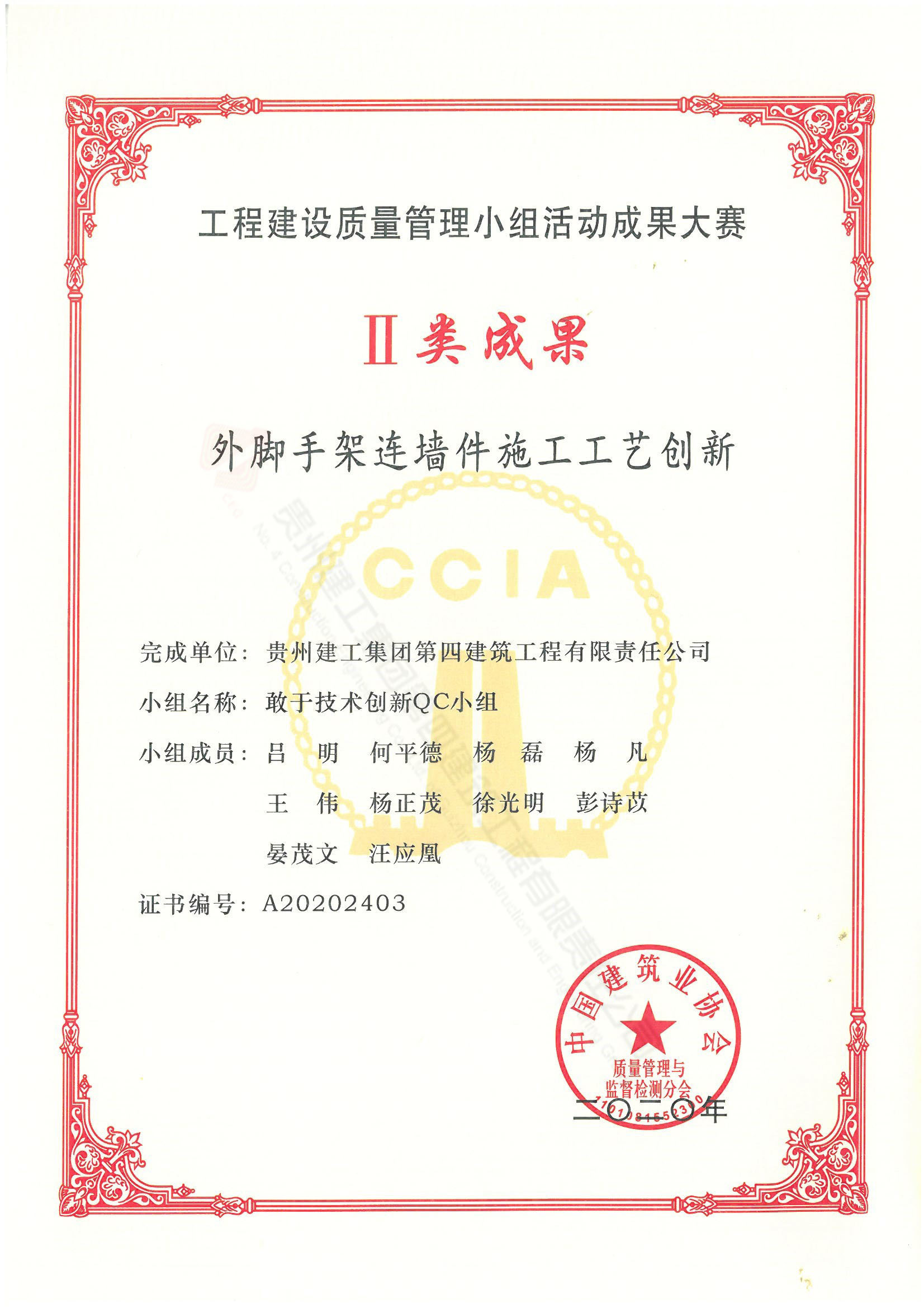 贵州建工集团第四建筑工程有限责任公司敢于技术创新QC小组,荣获中国建筑业协会2020年度全国工程建设质量管理小组活动Ⅱ类成果奖。