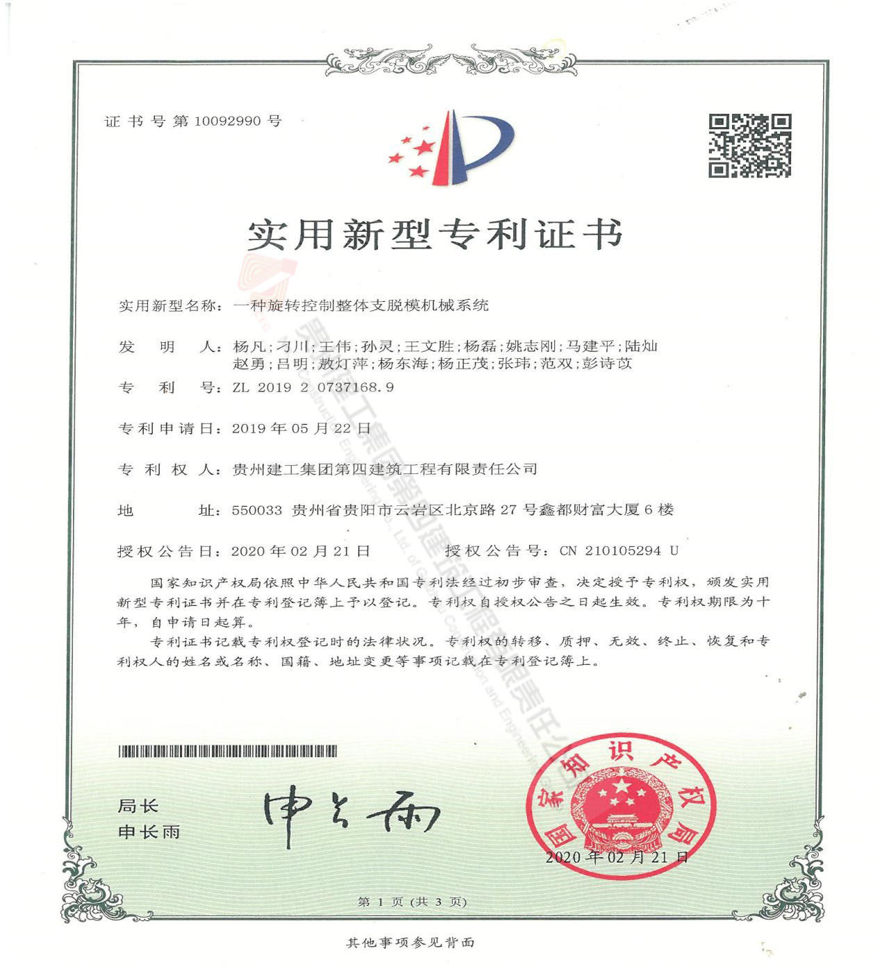 《一种旋转控制整体支脱模机械系统》专利获2020年“国家实用新型专利”